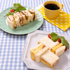 【B】を混ぜ合わせ食パンに塗り、千切りにしたレタスをおいて<3>を置き、食パンで挟む。食べやすい大きさに切る。