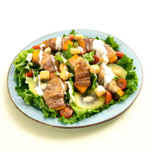 グリーンリーフにキウイフルーツ、ミニトマトを飾り、<6>をのせ、シーザーサラダドレッシングをお好みの量をかける。
