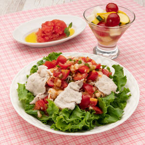 器にグリーンリーフをひき、<4>を盛りつける。<3>をたっぷりと回しかける。