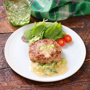 器にハンバーグを盛り、<4>をかける。ベビーリーフと半分に切ったミニトマトを添える。