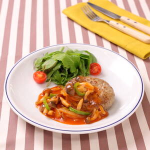 ナポリタンソースの玉ねぎは薄切りにする。しめじは小房に分ける。ピーマンは5mm幅の輪切りにし、さらに半分に切る。