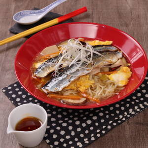 【盛り付け】器に麺を盛り付け<9>のスープを注ぎ、トースターで焼いた<11>のさんまを乗せる。