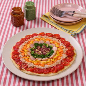 お好きなソースをぬり、ピザ用チーズをのせる。お好きなトッピングをのせ、鍋肌からオリーブオイル(分量外)をまわしかける。