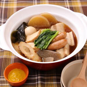 鍋に【B】を入れ、中火で熱する。こんにゃく、厚揚げ、ちくわ、ゆで卵、昆布、ソーセージを入れゆっくりと沸騰させる。