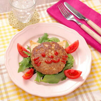 ラップを取り、1cm幅に切ったら、ハム、黒ごまで猫の顔を作る。