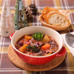 牛こま肉に塩、こしょうをふる。にんじんは皮をむいて小さめの乱切りにする。ドライクランベリーは5mm角に刻む。