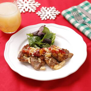 パイ菓子を手で大きく砕いて豚肉にかける。ベビーリーフ、れんこん、マッシュルームを添える。