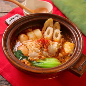 鍋にごま油(分量外)をひいて中火で熱し、挽き肉と長ねぎを炒める。挽き肉に火が入ったら豆板醤を炒め合わせる。