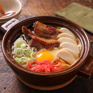 <2>、長ねぎ、かまぼこを盛り付けて中心に卵を割り入れ、再度ふたをして1分ほど煮込む。紅生姜をそえる。
