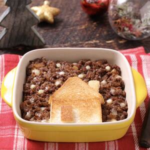 ミートソースをかけ、ログハウスを組み立て、雪のチーズを散らす。250度のトースターで3分焼く。