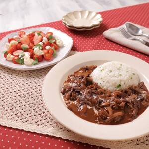 玉ねぎは5mm幅のくし切りにする。マッシュルームは薄切りにする。