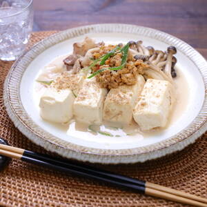 しめじは小房に分ける。豆腐はペーパータオルで包んで耐熱皿に置き、電子レンジ(600W)で2分加熱し粗熱を取る。
