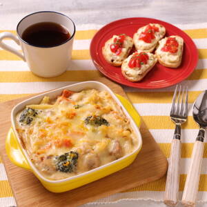 バケットの上に<2>を塗り、ミニトマトをのせ、パセリを散らす。皿に盛る。