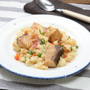 <7>に<4>を入れてさっと混ぜ合わせ、温め直したら器に盛り付ける。