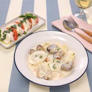 鍋にバターを弱火で熱し、残りの玉ねぎ、にんじんを炒める。しんなりしたらあさりを加えて蓋をし、中火で加熱する。