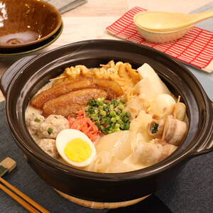<8>に<7>を丸めながら入れる。大根、肉巻き、ちくわぶ、ゆで卵、<2>をとじ口を上にして倒れないように入れる。