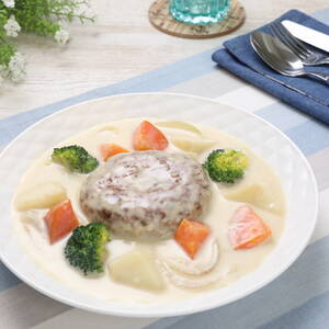 野菜に火が入ったら火を止めて、器にハンバーグを盛り付ける。シチューにホワイトチョコレートを入れて混ぜとかし、盛り付ける。
