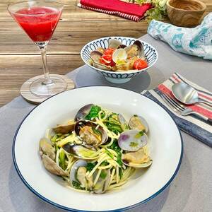 あさりの口がすべて開いたらバター、しょうゆ、お好みで梅酒大さじ1(分量外)を入れて混ぜ合わせる。