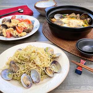 フライパンに酒とあさりを入れて中火で熱する。沸騰したら蓋をしてあさりの口が開くまで蒸し、開いたら汁ごと取り出す。