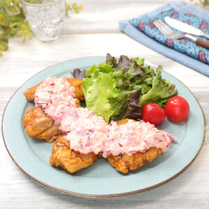 <9>を盛りつけ【しば漬けタルタル】をかけ、お好みでサニーレタスとミニトマトを添える。