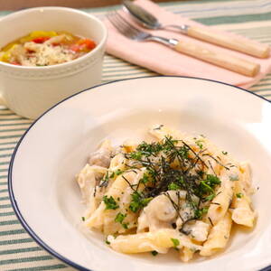 鍋に【A】を沸かし、ショートパスタをパッケージの表示時間どおりに茹でる。ザルでお湯を切って<3>に加える。