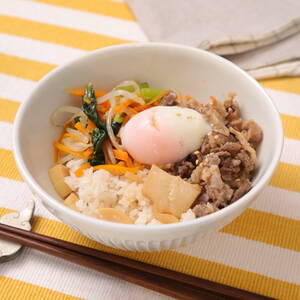 器に<7>、<5>、<6>を盛り付けて中心に温泉卵を乗せる。