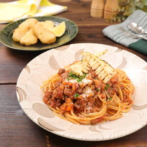 <6>を器にもりつけ、くし切りのレモンを添える。
