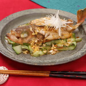 器にきゅうりを敷いて<7>を盛り付ける。<3>をかけてラー油を散らす。水気を切った白髪ねぎを添える。