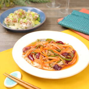 玉ねぎは薄切りにする。にんじん、ピーマンはヘタと種をとり、千切りにする。