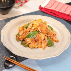 ピーマンはへたと種をとり、1口大の乱切りにする。キャベツは食べやすい大きさに手でちぎり、芯の部分は包丁で薄切りにする。