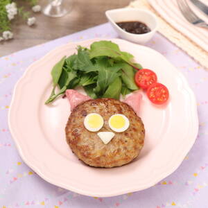 <7>のハンバーグに猫の耳や顔になるようにローストビーフとうずらの水煮を盛りつける。