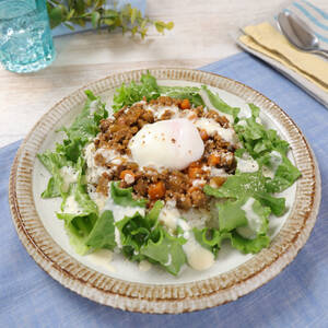 器にご飯をよそい<6>を盛りつける。<1>を乗せる場所を軽くへこませ<1>を落とす。お好みでレタスをちぎりのせる。