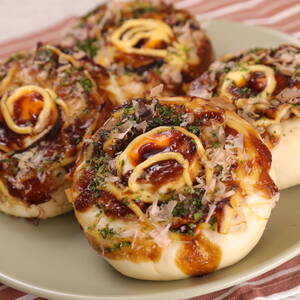 ラップを外して、お好みソース、マヨネーズをかけ、190度に予熱したオーブンで12~14分加熱する。