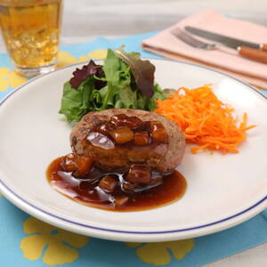 【ハンバーグ】玉ねぎをみじん切りにして耐熱ボウルに入れ、ふんわりラップして電子レンジ(600W)で1分加熱する。