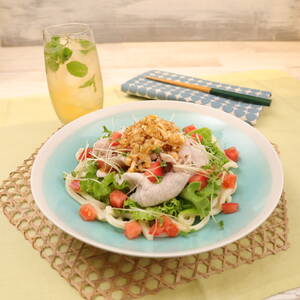 器にうどんを敷き詰め、レタスと<4>を上にのせる。トマトとかいわれ大根を散らし、<2>を回しかける。