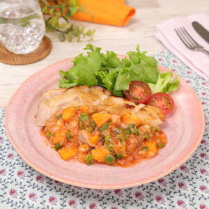 器に<10>を盛りつけ<4>をかける。グリーンリーフやお好みの野菜を添える。