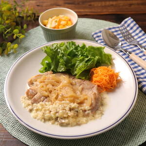 バターの5gを溶かして薄切りの玉ねぎを炒める。しんなりしたら【B】を加えてひと煮たちさせる。