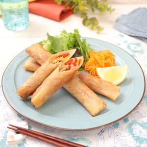 まな板の上に春巻きの皮を1枚置く。春巻きの皮の手前に横長に<5>の1/6量をのせて手前の皮を奥側にかぶせる。