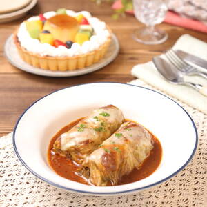 器に<13>を盛りつける。鍋のソースを塩、粗びき黒こしょうで味を整えてロールキャベツにかける。お好みでパセリを散らす。