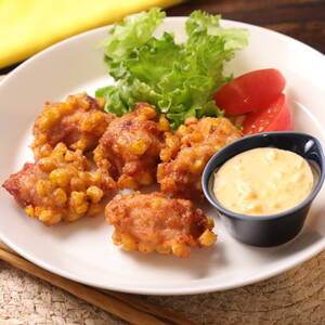 鶏肉が入ったボウルに【A】を入れて混ぜ合わせる。<6>に入れて全面にまんべんなくとうもろこしを押しつける。