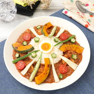 器にご飯と<6>を盛りつける。花火の形になるようにトッピングを盛りつける。