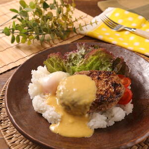 器に温かいご飯を盛りつけ、<8>、ミニトマト、サニーレタス、温泉卵をバランスよく盛り付け、ソースをかける。