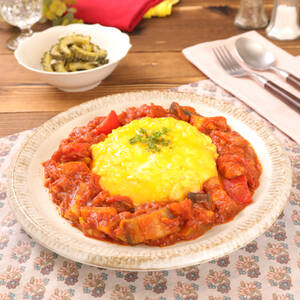 お好みの半熟になったら火を止めて<8>の上にのせ、まわりに<7>を盛りつける。同様にもう1皿つくる。