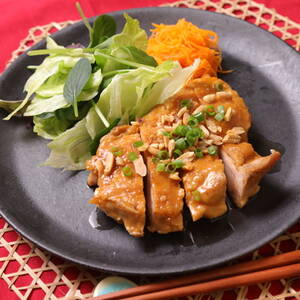 鶏肉を器に盛り付けたら、ごま油を回しかけ、白ごま、青ねぎ、ピーナッツを散らす。