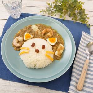 ゆで卵→猫耳、レーズン→目と鼻、スライスチーズ→ひげに見立て、猫の顔になるよう盛り付ける。