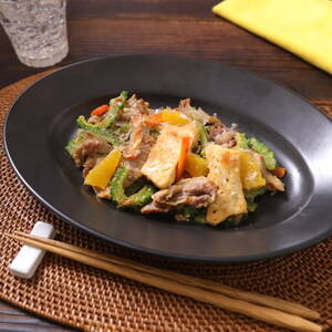 にんじん、ゴーヤを加えて炒め合わせる。火が通ったら豆腐を戻し、和風だしを加えてさっと炒める。