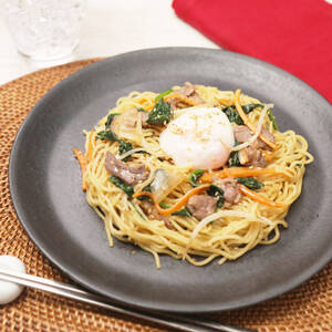フライパンを中火で熱し<1>を炒める。火が入ってきたら焼きそばの麺、<4>を水分ごと加えてほぐしながら炒める。