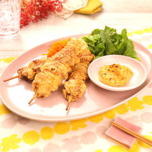 鶏もも肉は下処理をして1.5〜2cm程の角切りにする。串にさして水分をキッチンペーパーなどで軽くとり、両面に塩をふる。