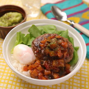 器にごはん、レタスをちぎって乗せ、<7>を盛り付ける。<4>をかけて温泉卵を乗せる。