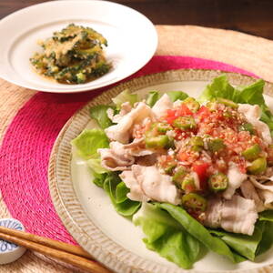 器にレタスをちぎって<4>を盛り付ける。オクラを輪切りにして<3>とさっと混ぜ合わせて豚肉にかける。